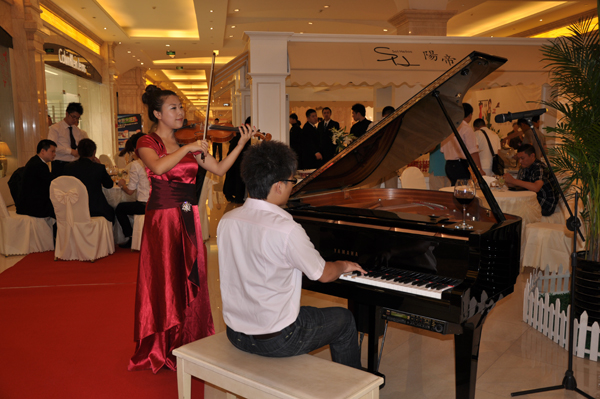 到场嘉宾在悠扬的琴声中品味红酒、品尝甜点