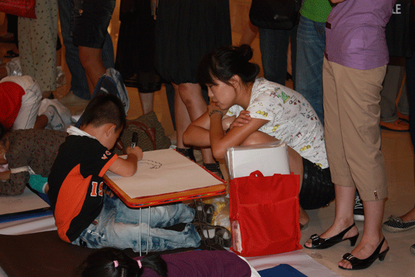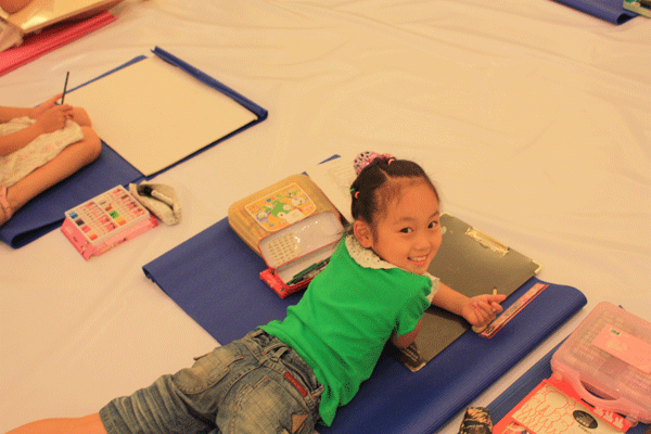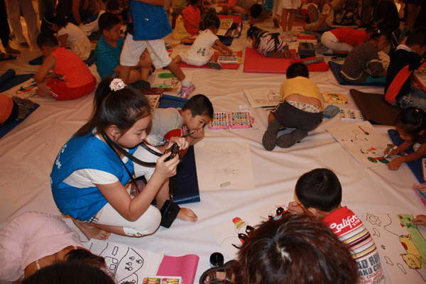 150名参赛的孩子,场面很壮观 准备的很充分,可以开始了 因为本次比赛的孩子年龄要求不超过十岁,所以作为主办方的红博考虑到孩子年龄太小,又需要在地上作画,特意准备了瑜伽垫,很人性化。 孩子创作中 家长最关注 画的真是又快又好 在比赛过程中,我们发现有些孩子很有绘画天分,无论是线条还是色彩都把握的十分好。 小小摄影家 在比赛中,我们发现了一群特殊的身影,他们是参加7月23日启幕的“红博杯”小小摄影家比赛的小朋友们。 很专注 这群摄影的孩子,穿梭在画布间,用自己独特的视角寻找着美丽。 大功告成,拍照留念 比赛在四点半的时候顺利结束,历时2个半小时。