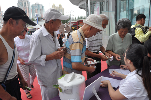 许多消费满100元的顾客和持身份证的老人到现场免费领取鲜香米