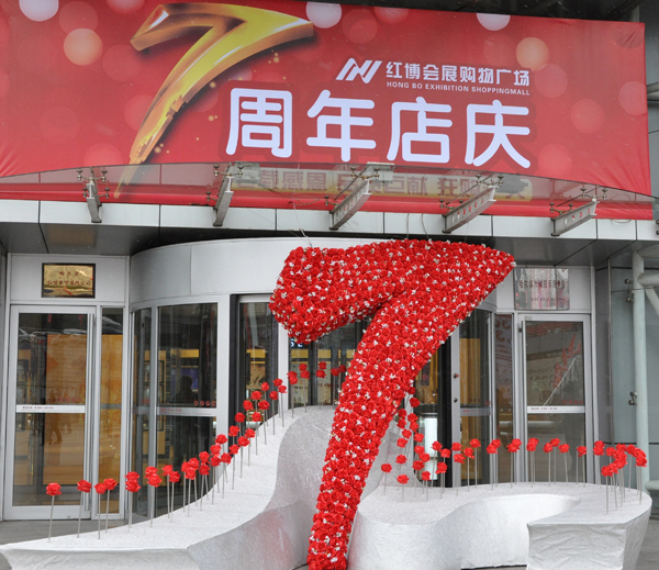 伴着轻快的乐曲步入红博会展购物广场,殿堂般的购物环境令人眼前一亮。店内通道口有红色的花门迎接顾客、每个店面内都摆放红色鲜花将商场装点一新。为了迎接红博会展购物广场7周年店庆,少淑女装区C座、成熟女装区D座、儿童区、内衣区等涉及2万余平面米的空间新装亮相,众多知名品牌争相进驻,品牌店面设计独特,体现服饰文化内涵。华丽的雕花墙壁、彩色玻璃装饰、红色花朵吊顶,整体展现时尚、靓丽的殿堂风格,为店庆期间来到红博的顾客提供了一个崭新的购物环境。 红博始终将“品质文化引领品质生活”为经营理念,伴随现代商业的发展不断将环境升级与品质升级相结合,历经7年的红博会展购物广场通过购物环境全新升级,树立全新形象,再一次展示品质魅力,强势引领哈埠市民品质生活。 红博会展购物广场正门一派喜庆的气氛 正门的“7”字造型格外醒目 全方位服务 品质升级七载共庆