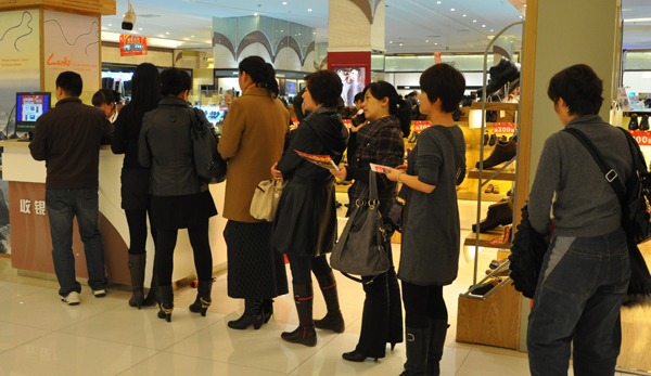 “购物愉快,欢迎您下次再来”热情周到的导购员微笑地送走了一位刚刚购物离开的顾客,每个收银台前的液晶屏上实时滚动着商场活动的最新信息、收银工作人员面带微笑地为排队的顾客结款,购物分级赠礼台前的工作人员耐心、细致为排队的顾客派发礼品……商场的各处充满了一片繁忙而又有序的场景。“食尚空间”餐饮区里座无虚席,南北佳肴、中外美食令前来购物顾客不仅买到了心仪的服饰,更大饱口福、尝到了美味的佳肴。 红博会展购物广场经过7年的文化积淀,服务品质不断升级。在7周年店庆期间通过全方位的品质服务,与广大顾客一同分享和庆祝七岁生日。 顾客在导购员的热情讲解下挑选服饰 每个收银台前顾客们都井然有序地排队结款 感恩巨献 引爆七载购物狂潮