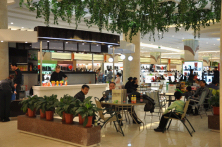 许多顾客逛累了就在这“绿荫树下”般的休息区小憩,喝杯饮料、聊聊天,享受春节假期难得的休闲时光