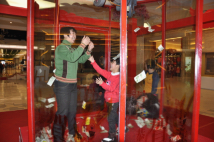 过大年期间,凡顾客当日购物累计满1200元、VIP满1000元即可到“抓财屋”参与限时抓现金活动。看着漫天飞舞的“钞票”,紧张、刺激、好玩的限时抓现金活动吸引了众多顾客积极参与,有的顾客为现场“抓钞票”的顾客加油鼓劲儿、有的顾客边看边寻找“抓钞票”的小诀窍,互动交流、竞技娱乐,一片欢乐喜庆的海洋。