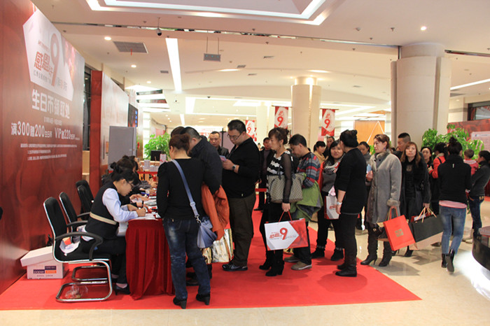 车刚开进红博会展购物广场VIP停车场附近就排起长队,市民赵先生告诉记者,“已经在停车场前等了好一会儿,妻子孩子先进去狂购了”。由于消费者太多,VIP停车场已经一位难求。走进红博会展购物广场,浓浓的节日氛围随处可见,一丛丛一簇簇被红色装点的长廊上,挤满兴高采烈购物的消费者,“这件三百二,这件没花钱……”手里提着四五个购物袋的张女士告诉记者,“别管什么节日,别管哪家商场,对于老百姓来说实惠是最重要的。”记者在现场看到,几乎每个人手里都提着三四个购物袋,收银位置已被堵得死死,许多素不相识的人也三三两两结成队,一个上厕所,一个休息一会儿, 一个接着排队。由于此次店庆在折让基础上还赠送生日币,可等同现金使用,所以在生日币兑换处,记者真正明白了什么是大排长龙,市民张女士表示“已经排了一个多小时的队,女儿还在买,买完了可以直接过来领生日币,领完了还可以接着买”。记者随机走访了几家业户,发现不少新款全市独家参与折让活动,而且珠宝和化妆品均有全城独家的特供款,据商场工作人员介绍,本次促销力度前所未有,与各业户也达成共识,在店庆期间必须保证产品的的价格是全市最低,货品也要充足和独家!