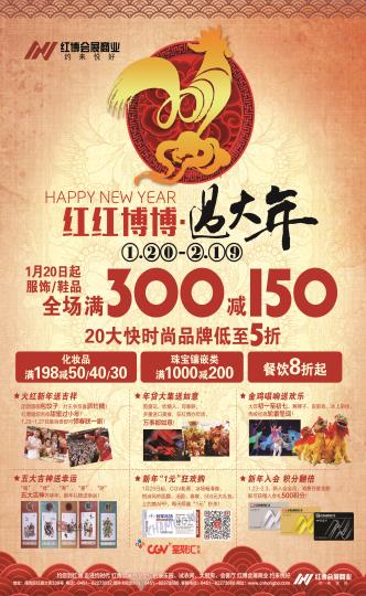 红红博博过大年!红博会展商业喜迎新春!鞋服满300减150,20大快时尚品牌低至5折!迎春传心意,惊喜送不尽,吃灶糖、包饺子、送春联,福到、吉到、团圆到!红包摇一摇、抓钱开怀笑!初一到初七,舞狮、杂技、皮影戏!购物拍大奖,新年好运气!福禄寿喜财,五大吉神送好礼!